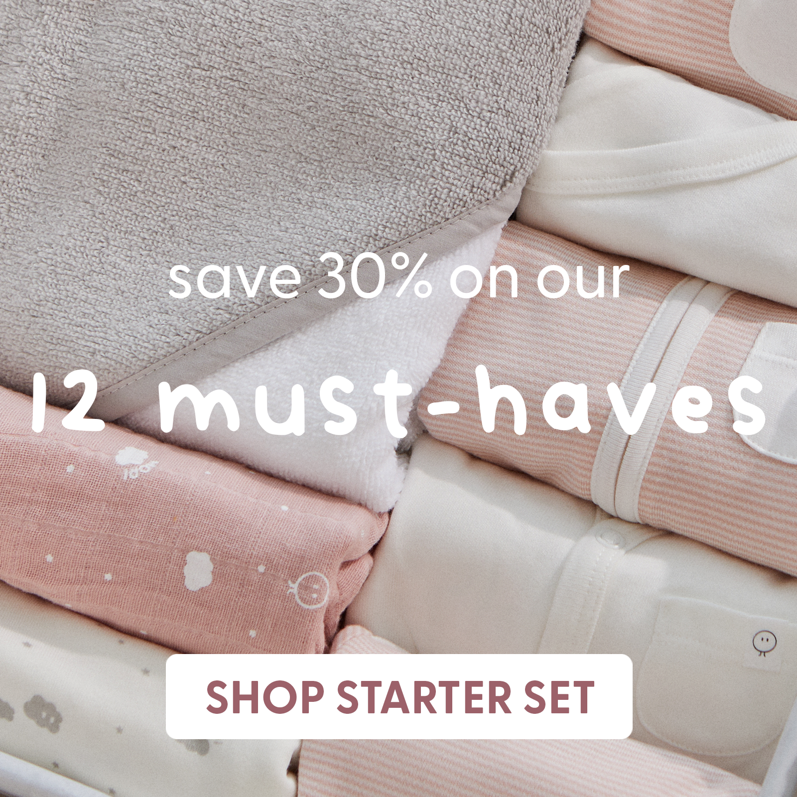 Save 30% on a curated collection of up to 12 essentials made of soft organic fabrics. Designed to keep little ones comfortable and safe. Discount applies to specific items in the Starter Set collection.