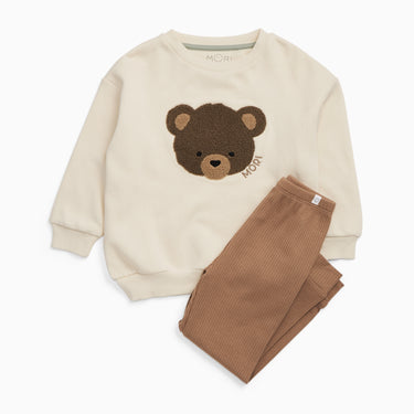 Cosy days just got cuter. Our Bear Oversized Sweatshirt & Ribbed Leggings Outfit features a relaxed fit and a bear face on the front of the sweatshirt, making it the ultimate go-to for comfort and style - perfect for lounging, playdates or just about any adventure. Paired with comfy ribbed leggings, designed for crawlers and explorers. Crafted in the softest blend of organic cotton and bamboo, they have a little stretch so there's room to move.