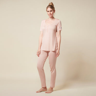 Our Maternity & Nursing Pyjamas are made in the softest lyocell with natural stretch for comfort. Side slits on the top mean it adapts to your growing and changing shape throughout pregnancy and post-partum and buttons down the front offer easy access for feeding or pumping. The bottoms have an elasticated waistband to be worn under or over your bump. They have a tapered shape for a stylish look & feel.