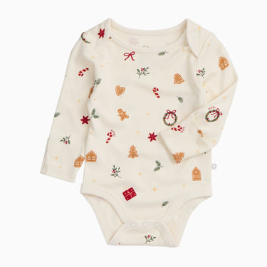 A festive first layer perfect for chilly days or cosy nights. Our Christmas Bodysuit is made from our soft signature fabric and features a joyful print with wreaths, candy canes gingerbread biscuits.