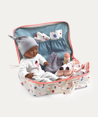 In this adorable Baby Doll Suitcase, your child gets Baby Cerise, plus everything she needs to go on holiday, worry-free: PJs, a hat, a change of clothes (front-closing wrap-over top, bloomers and a pair of booties), a nappy, a feeding bottle and a bib. Baby Cerise is lightweight and the perfect size (32cm) for little arms, with a soft body and head, arms and legs made of soft-touch vinyl, making her a joy to cuddle and play with.