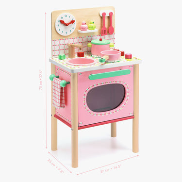 A colourful wooden cooker with oven, hob, sink, utensils and seasoning shakers – just like a grown-up kitchen.