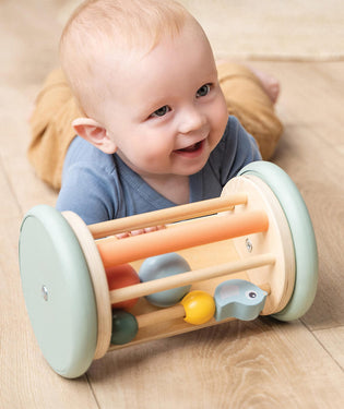 Perfect for tummy time or when your baby is old enough to sit up, Done By Deer's Rolling Activity Mirror stimulates and motivates your baby to crawl as it rolls. It's got soft, rounded edges to protect your floors and when you pop it upright, the mirror and beads add an element of self-discovery and enhance their fine motor skills.