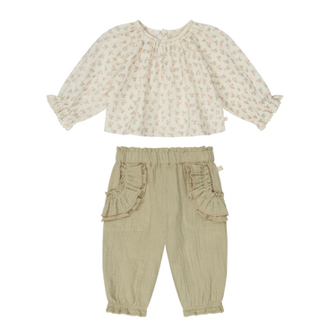 Floral Muslin Bloomer Blouse & Sage Muslin Frilled Trousers Outfit