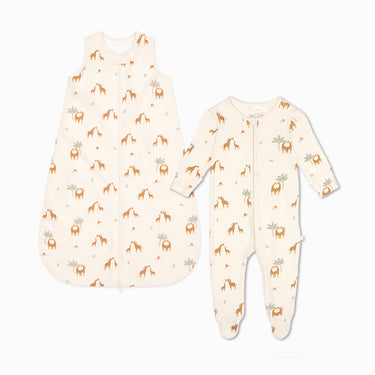 Take their bedtime routine to new heights with this giraffe-printed set. It includes our bestselling baby sleepsuit, which features a clever two-way zip down the front for fuss-free changes. Layer it under the 1.5 TOG sleeping bag, which can be safely worn all year round. This essential has an adjustable length and easy zip from the bottom.