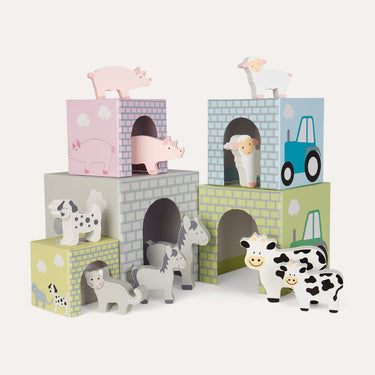 Their senses will be stimulated and their skills will develop as they play with the Stacking Cubes Animal. This set includes 5 colourful and stackable cubes, each with two different animals housed inside. Great for playing with in different ways, they'll love discovering the big and baby wooden animals in the boxes, pretend playing with them in their little houses. They can be encouraged to develop their counting skills too, by pointing out the numbers on the sides of each cube. If building is more their thing, they'll love placing them into a tower. Made from cardboard, they are sturdy but don't hurt if they come tumbling down.