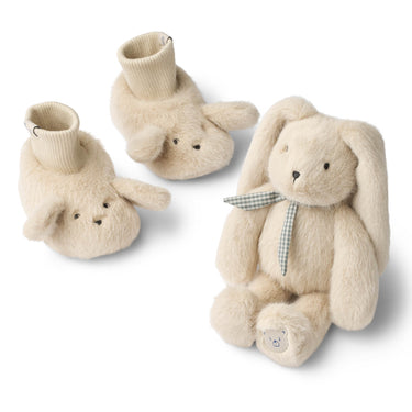 The Basim Rabbit Baby Plush Gift Set - Mist is a comforting duo for the tiniest toes and hands. Featuring a soft recycled-plush rabbit and cosy matching slippers, it's a sweet gift for newborns and perfect for those first wiggles and crawls.
