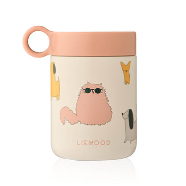Liewood's Kiani Printed Food Jar is your go-to sidekick for outdoor adventures and snack-worthy expeditions. Perfect for porridge, snacks, or drinks on the go, it features double stainless-steel walls to keep food at the right temperature. The playful silicone sleeve adds grip, while the leak-free lid with a hooped handle can be clipped onto prams or bags with ease. Rugged, reliable, and ready for action this jar takes ""on-the-go"" to the next level.
