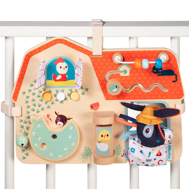 This charming wooden farm panel is full of activities, textures, and illustrations to spark little ones' curiosity. Easily attachable to a playpen with Velcro fasteners, it invites sensory play and storytelling with friendly farm animals.