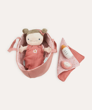 • Baby doll + basket, blanket, cap, nappy, dummy & bottle