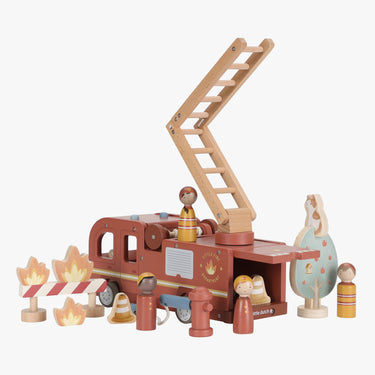 Rescue the cat from the tree! This wooden fire truck comes with an extendable ladder, detachable hose and accessories. Includes four firefighters, flames and a hydrant for exciting rescue missions.