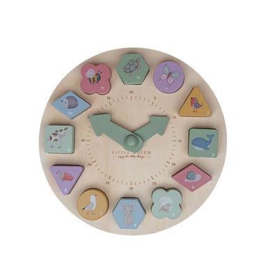 Teach your little one the basics of time with this educational wooden puzzle clock from Little Dutch. Featuring moveable hands and 12 animal-shaped number pieces, it makes learning fun. Perfect for teaching colours, numbers, and shapes by matching the right shape, colours and number with the right slot