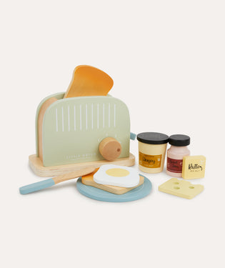 This wooden Toaster Set turns making breakfast into a playtime party. Your child can press the lever, and watch as the slices jump out of the toaster, then add toppings like jam, honey, ham, cheese - even egg! In the signature Little Dutch mint green colourway, this play set fits perfectly with the Little Dutch wooden and coffee machine.