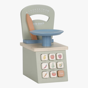 A perfect ingredient for every play kitchen! With this wooden play scale, little bakers and chefs can weigh their ingredients precisely. The needle moves to show the weight, and the illustrated knobs make cooking play even more realistic.