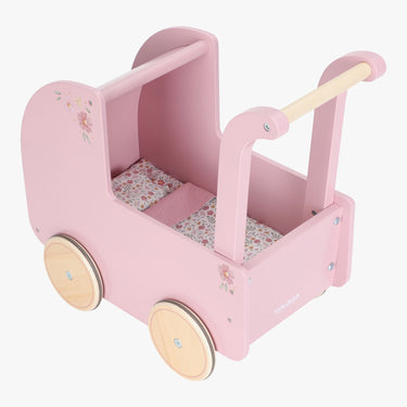 Take dolls for a stylish stroll! This vintage-inspired wooden pram comes with bedding in the beloved Soft Flowers design and smooth rubber wheels.