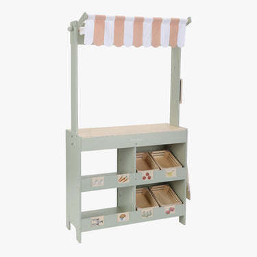 Welcome to the market! With this wooden market stall, children can play shop in their own store or café. The chalkboard, illustrated cards, crates and bag create an authentic experience, with a reversible design for double the fun.