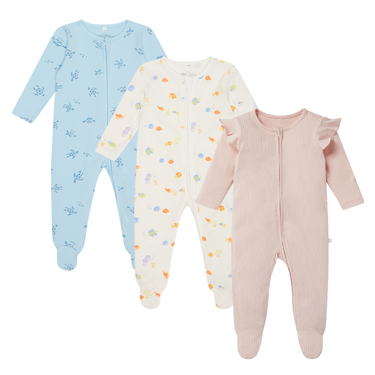 Little Fish, Turtles & Ribbed Frilled Clever Zip Sleepsuit 3 Pack