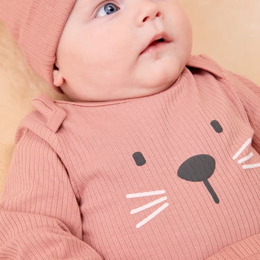 Purr-fectly easy dressing comes thanks to our little kitty outfit. It includes a long-sleeved bodysuit, footed leggings and a hat, all crafted in our irresistibly soft and stretchy ribbed fabric.
