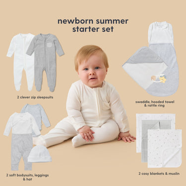 Our Starter Sets are the perfect beginning to every baby’s story - 12 pieces thoughtfully curated from our most-loved essentials, designed for every time of year. Made from the softest, sustainable fabrics to comfort baby and bring calm to those precious early days.