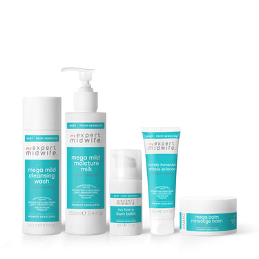 A baby's skin needs gentle care so enter this ultimate kit of fragrance-free skin care products, developed by midwives using naturally-derived ingredients. The set contains a Mega Mild Cleansing Body Wash, ideal for a targeted clean or poured into bath water, Mega Mild Moisture Milk Baby Cream which leaves their skin feeling soft & soothed, No Harm Bum Balm to prevent & soothe nappy rashes, Totally Immense Dribbe Defence, Super Charged Skin Salve for inflamed skin areas and Mega Calm Massage Balm.• Suitable from newborn