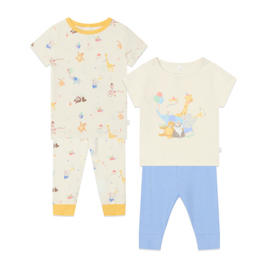 From morning play to dreamy nights, our Party Animals Short Sleeve Pyjamas and T-shirt & Ribbed Leggings Outfit 2 Pack has your little one covered. The t-shirt and leggings outfit are perfect for daytime adventures, while the pyjamas ensure a cosy night’s rest. Made from with a little added stretch to keep busy little bodies comfy.