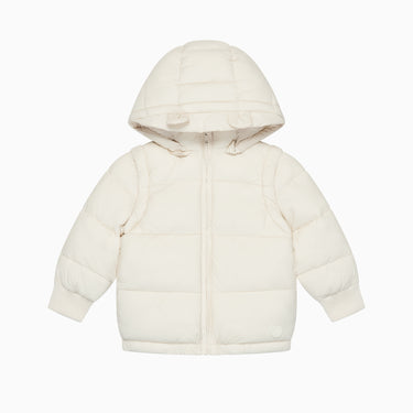 Thrice as nice! This clever coat has three styles in one with removable sleeves and hood via easy zippers. It's designed with cosy recycled padding to keep little ones snug.