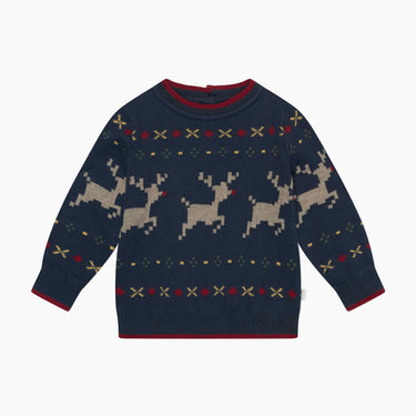 Wrap them up in a snuggly reindeer jumper. It's crafted from super soft organic cotton, meaning it'll last year after year. A reindeer and fair isle pattern makes it perfect for Christmas day celebrations & beyond. We've added buttons on the back for easier dressing.