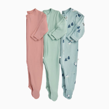 Make bedtime simpler with our Clever Zip Sleepsuit 3 Pack. Featuring one playful ski print in our signature fabric and two soft ribbed styles in Mint and Rose, each sleepsuit has a concealed two-way zip for quick, calm changes – even at 2am.