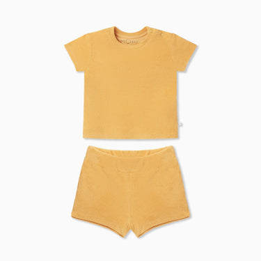 Our Terry Towelling T-Shirt & Shorts Outfit is perfect for those long summer days. Both pieces are crafted from a soft organic cotton blend that is breathable & moisture-wicking. The shorts have an elasticated waistband for quick changes.